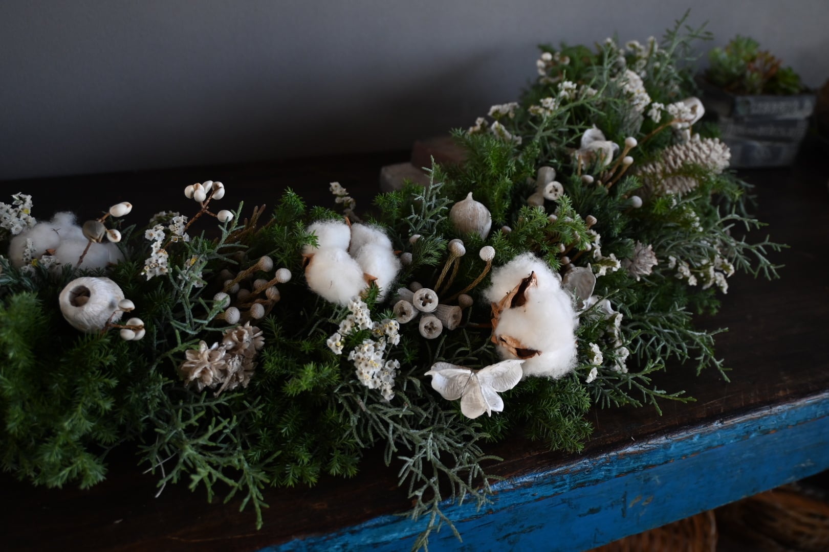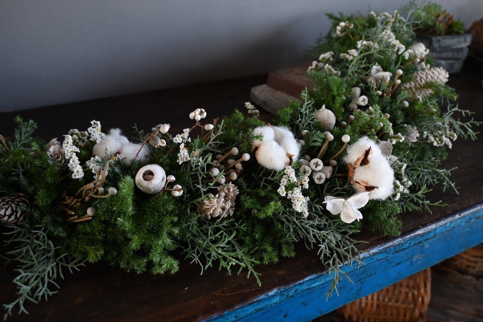 針葉樹などをベースとし、いろいろな種類の木の実をあしらった白ベースのガーランド。針葉樹の清しい香りや生花からドライフラワーになりゆく過程も楽しめます。