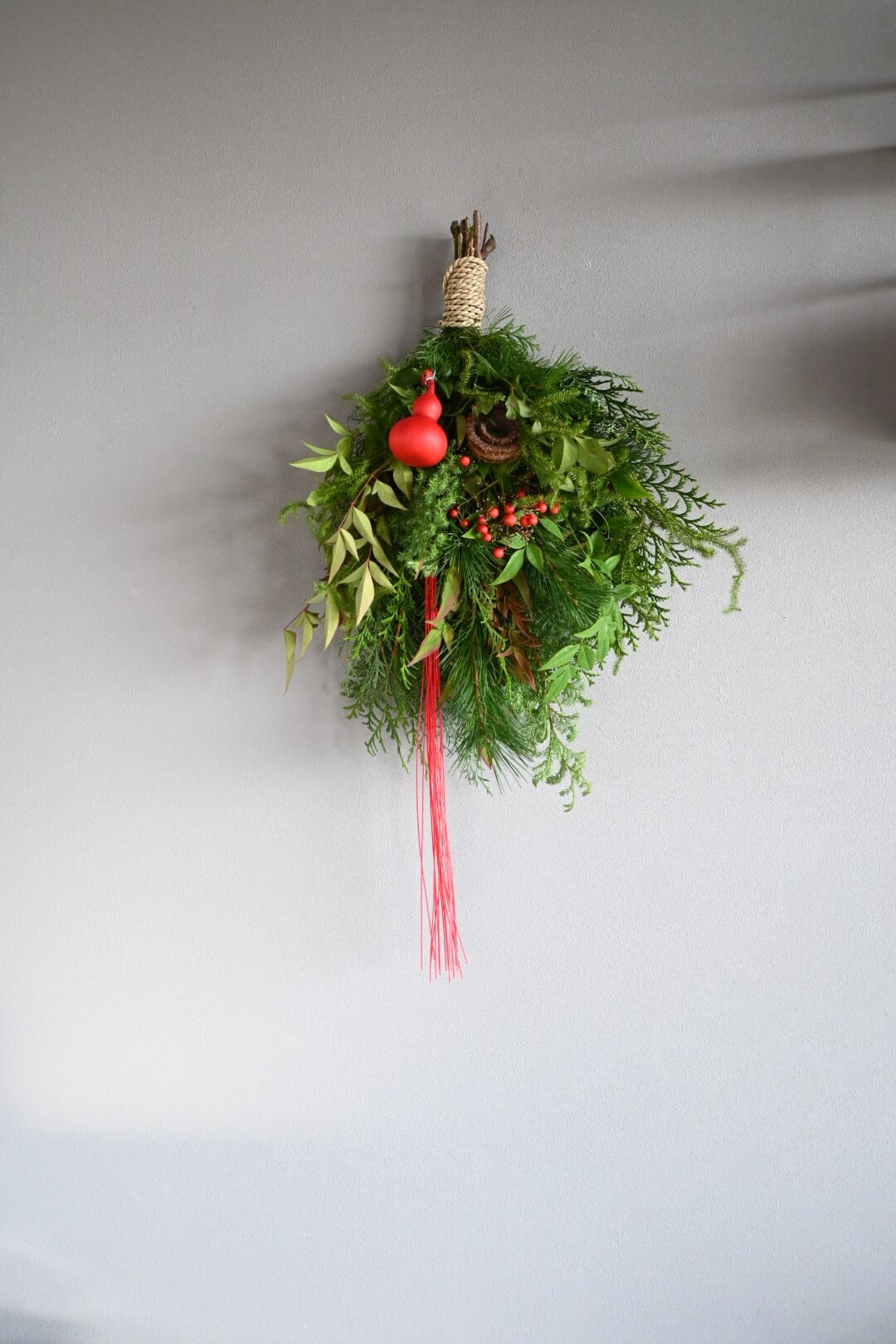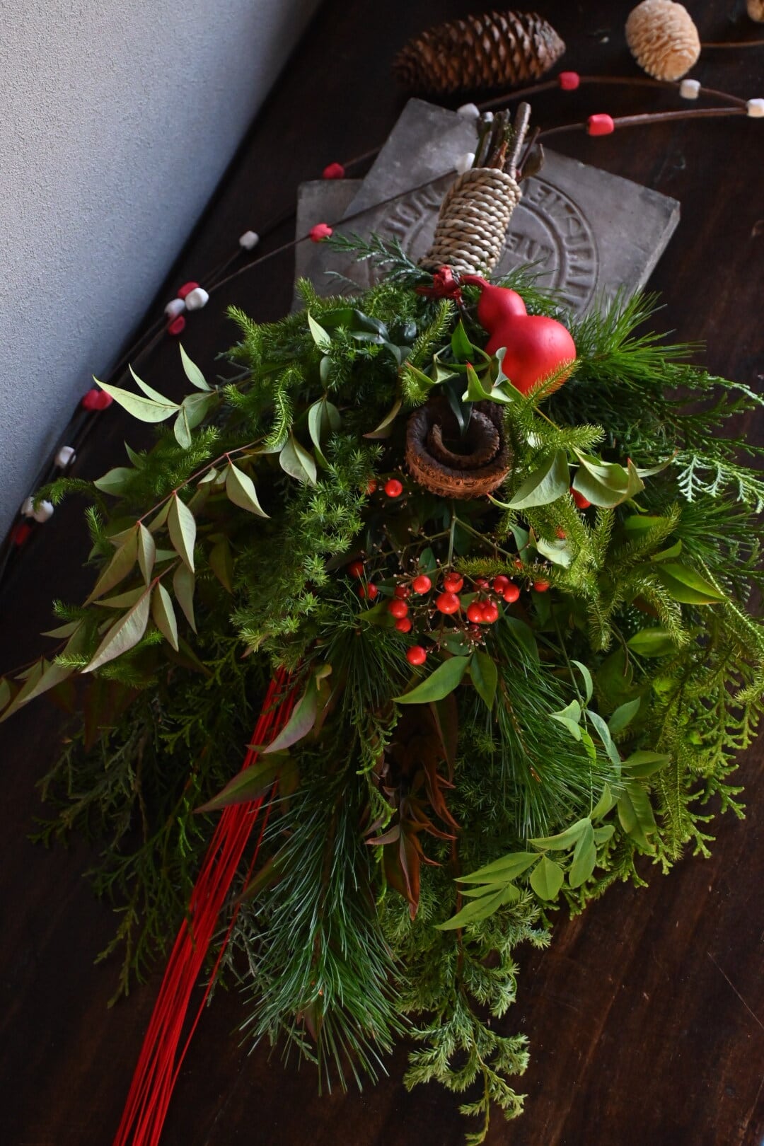 赤いひょうたんをポイントに松や南天などのグリーンを束ねたお正月に飾れるシンプルなスワッグです