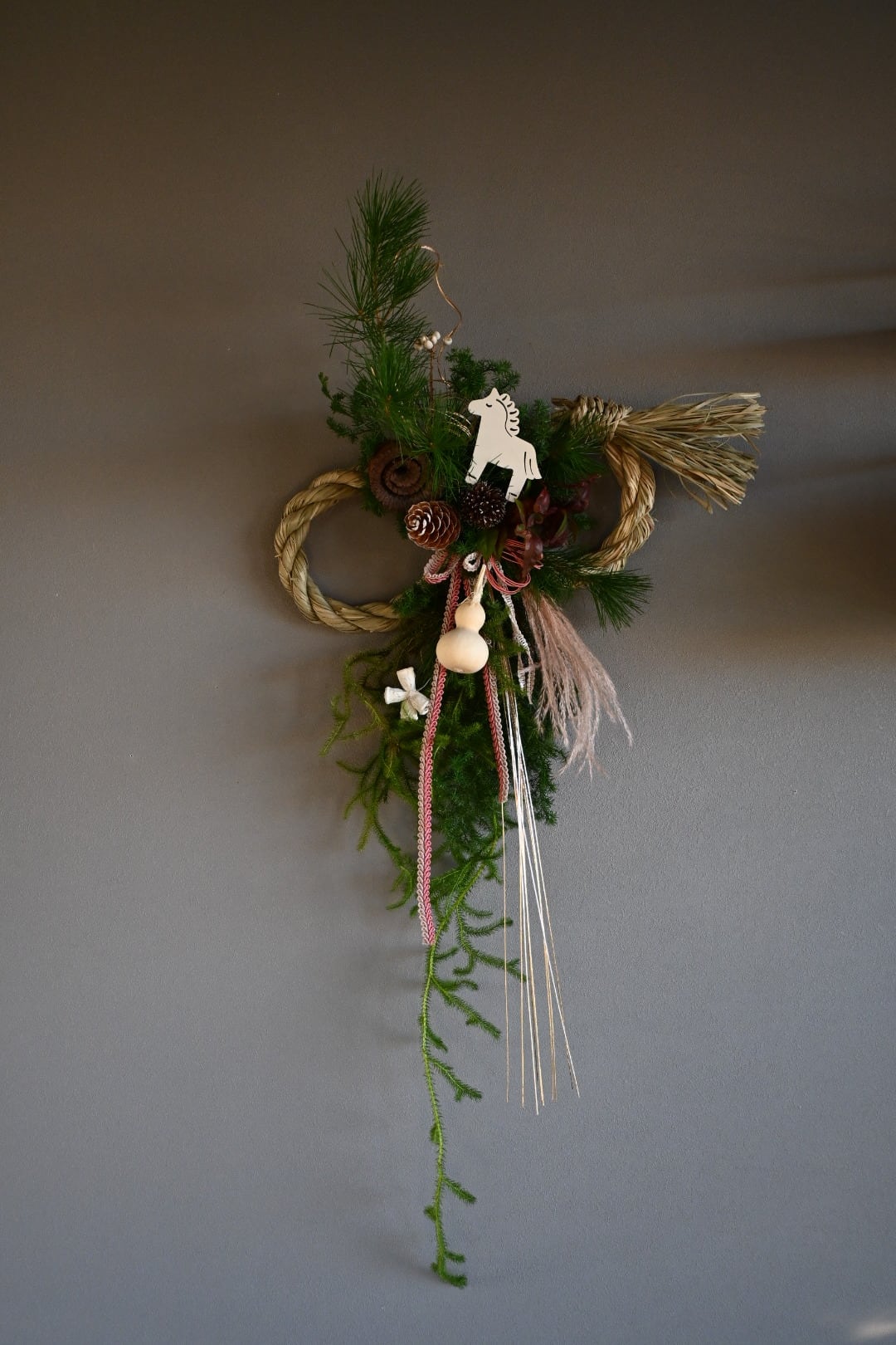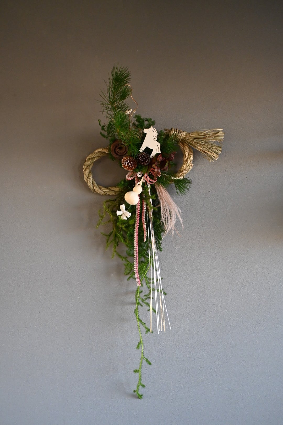 ガーリーな雰囲気のしめ縄飾り、干支の馬のピックやひょうたんなどをいれ、明るくお正月らしくアレンジしました。