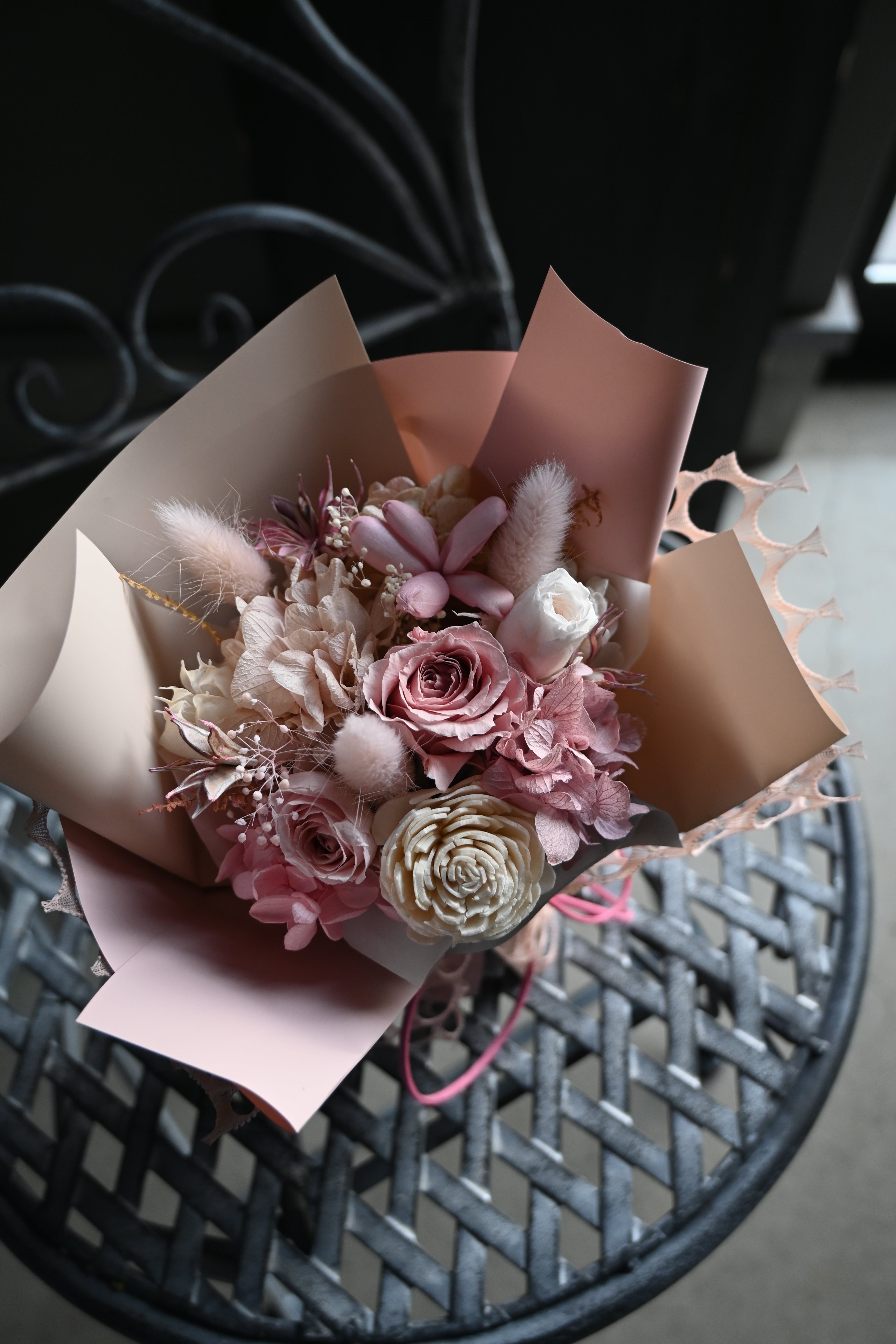プリザーブドフラワー【standing bouquet pink】は、心からの送別シーンを華やかに彩るスタンディングブーケです柔らかなピンク色の花々が、贈る方の想いを届けるお手伝いをします。大切な方の新たな門出に、ぴったりのアイテムです。