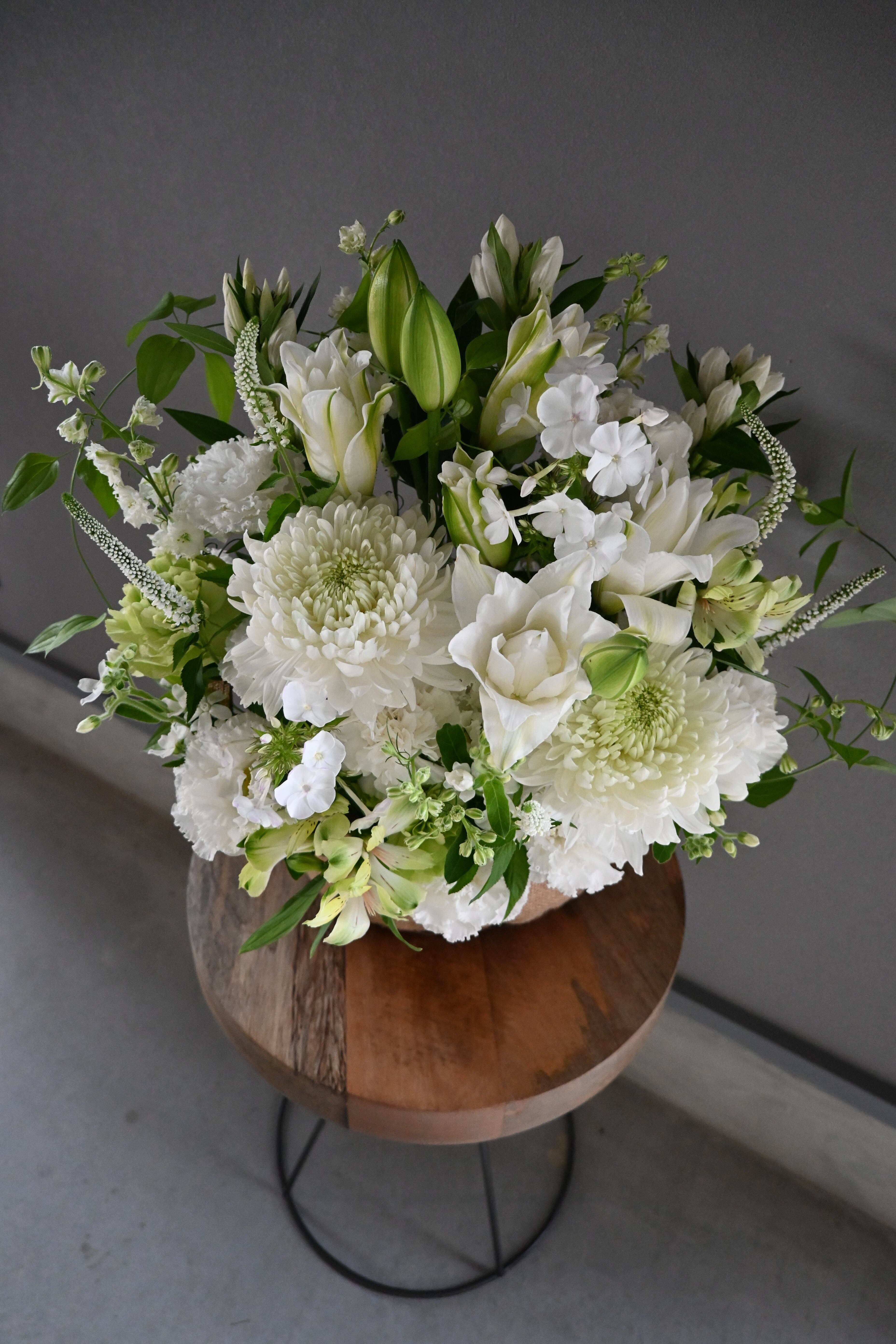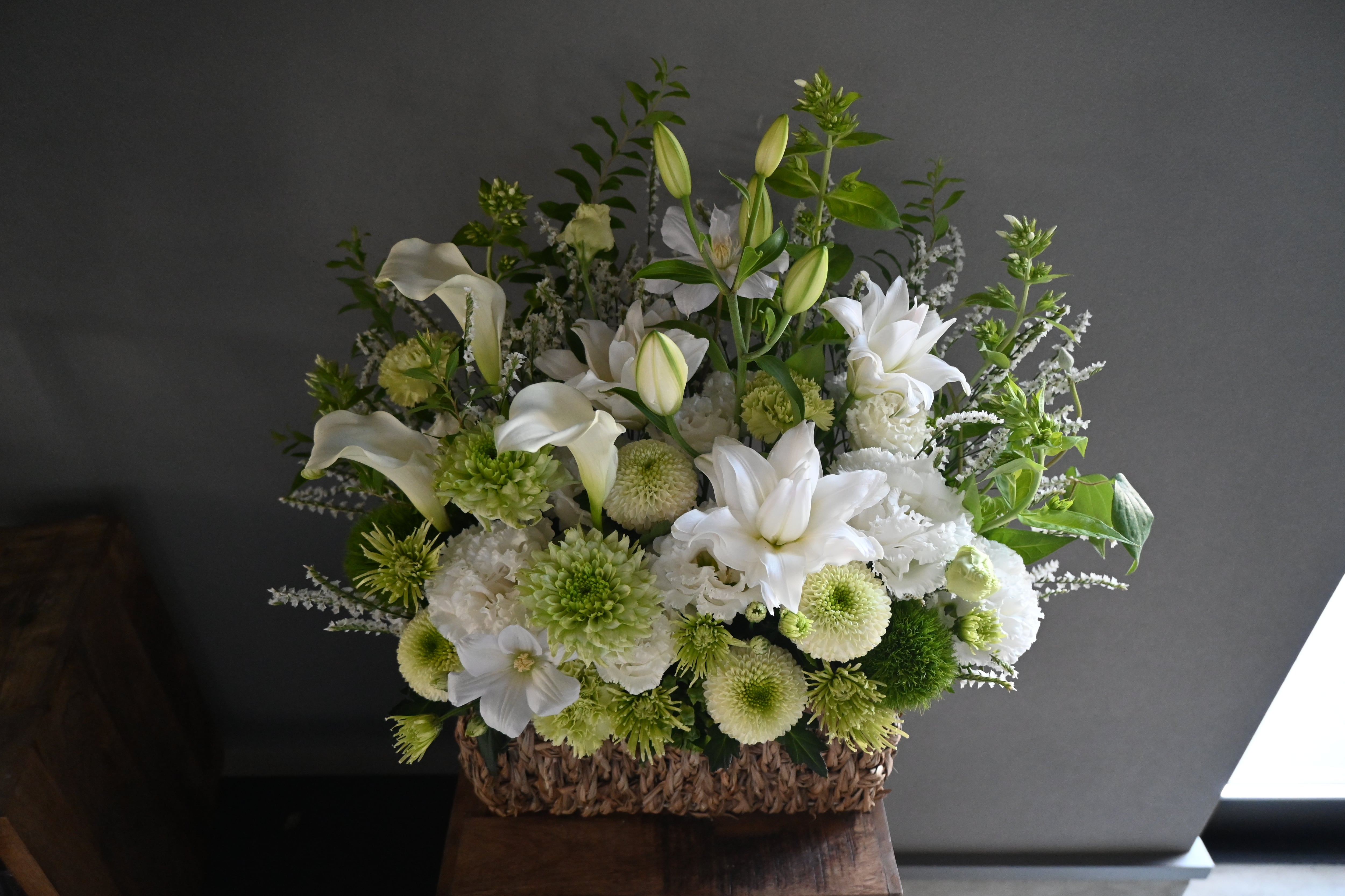 白を基調としたお花を中心に、お悔み・お供えのご用途にご利用いただけるアレンジメントです。
