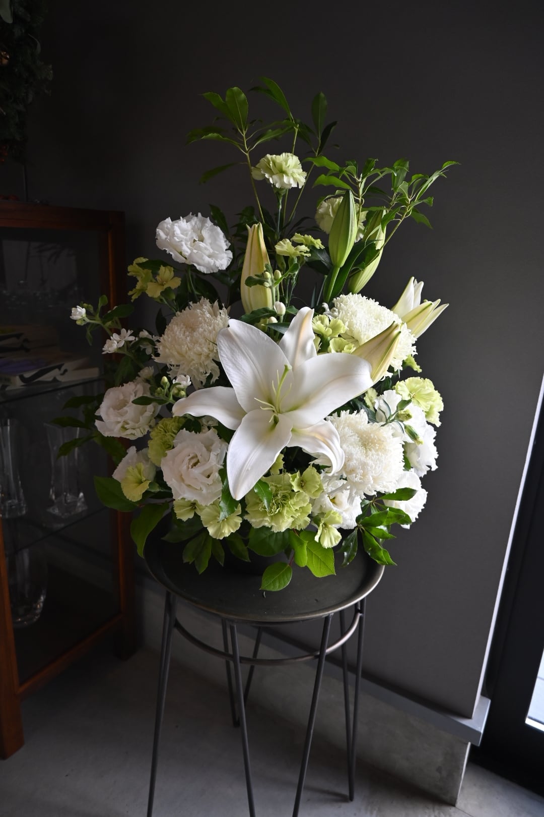 白を基調としたお花を中心に、お悔み・お供えのご用途にご利用いただけるアレンジメントです。