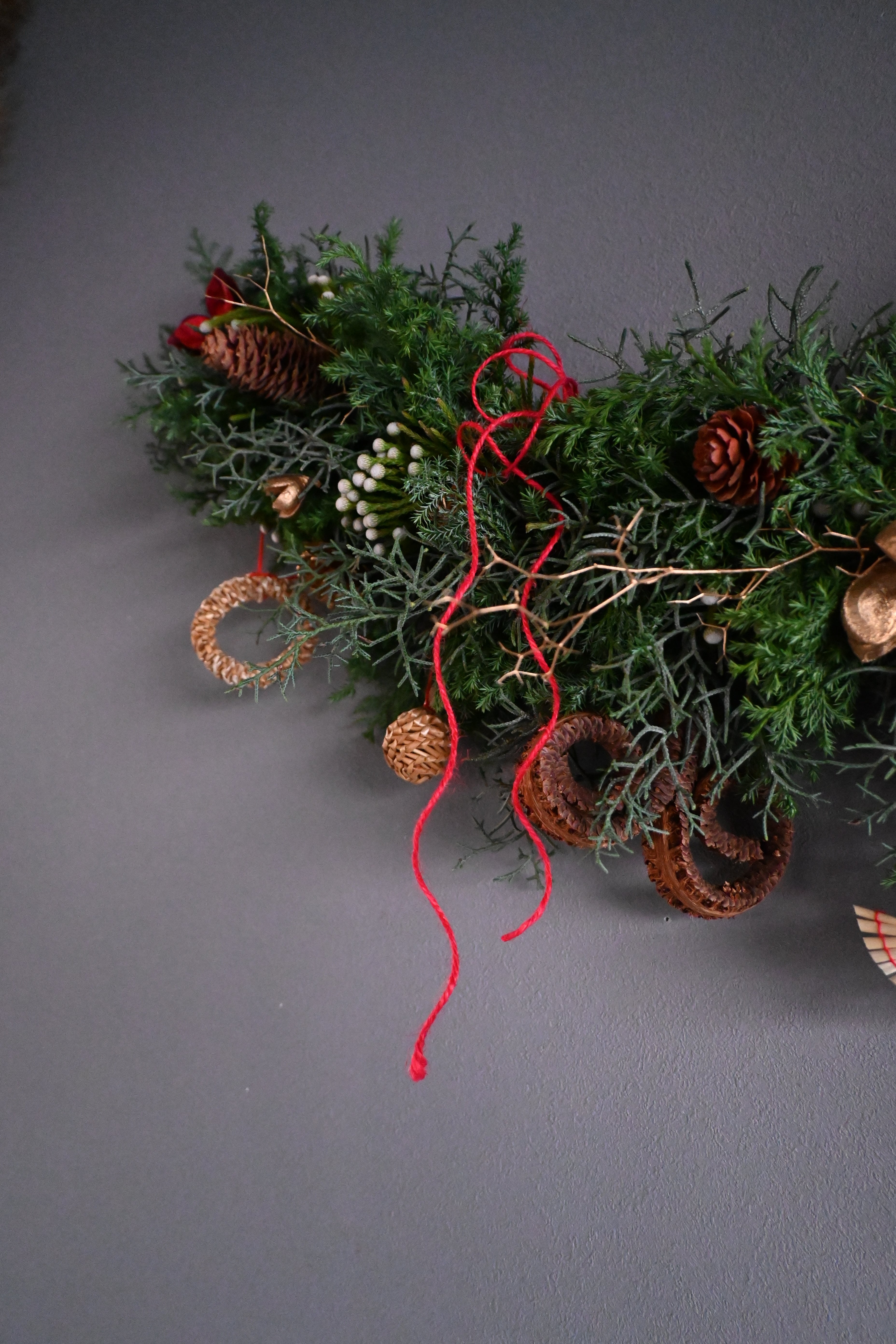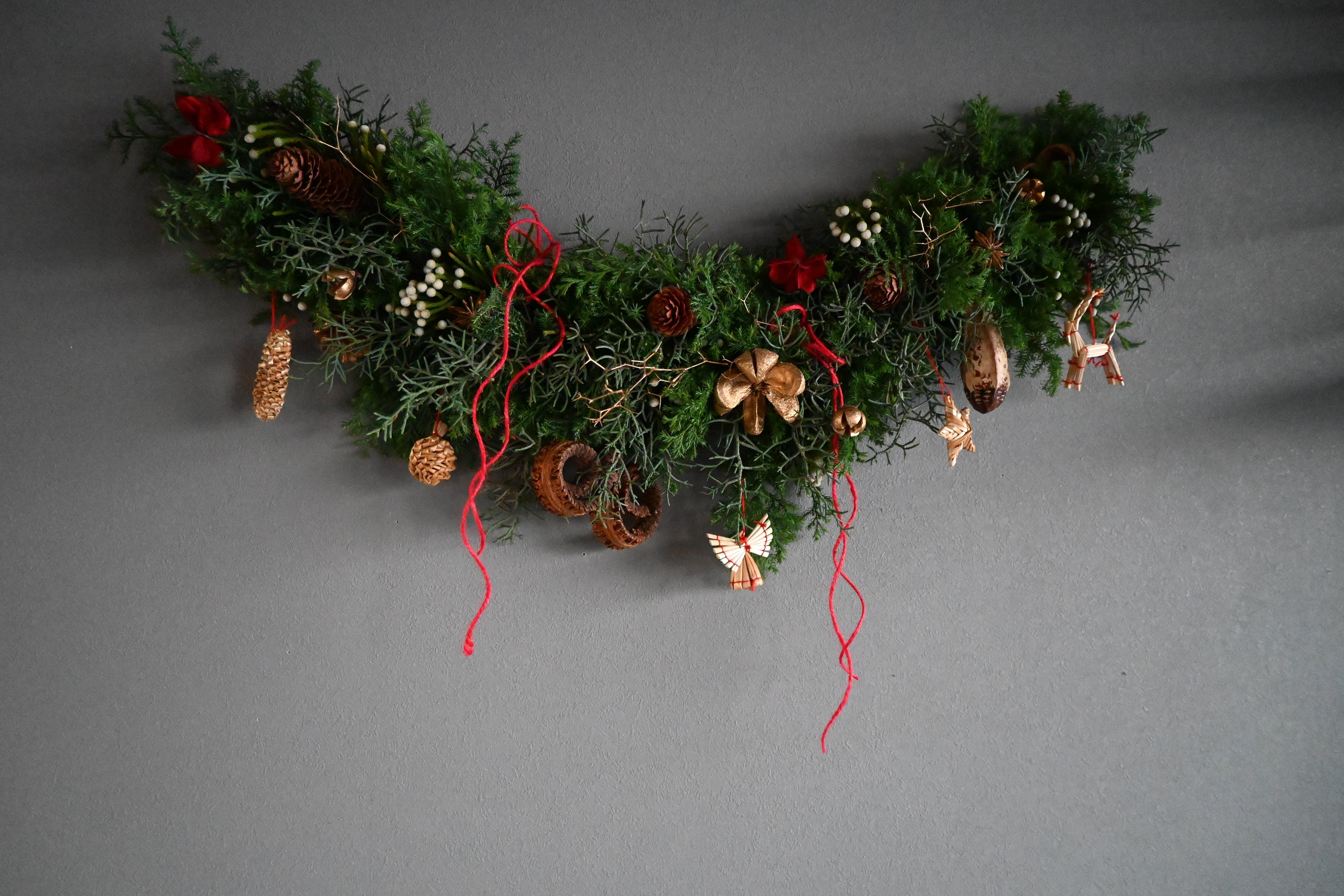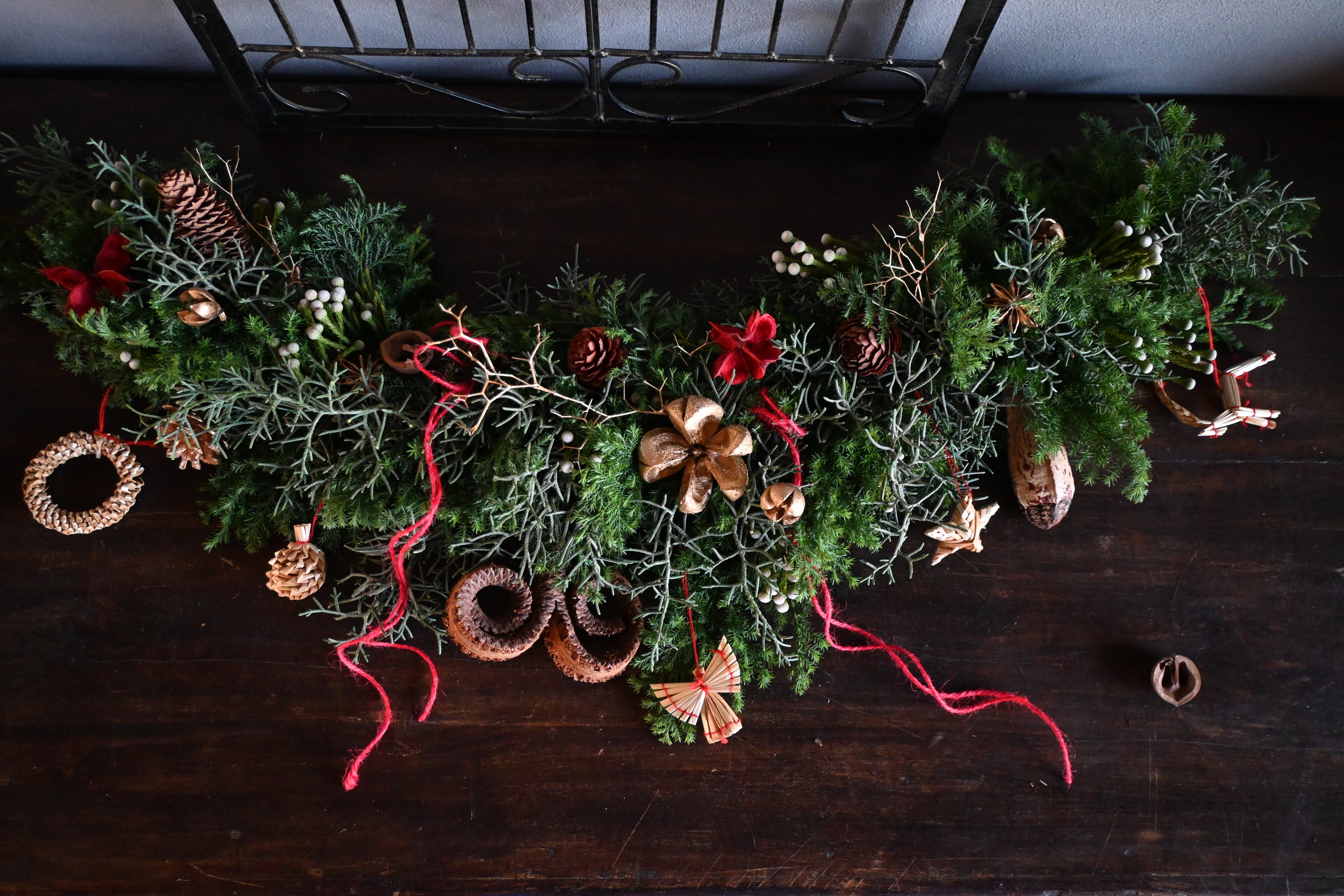 針葉樹などをベースとし、生花からドライフラワーになりゆく過程も楽しめるガーランド